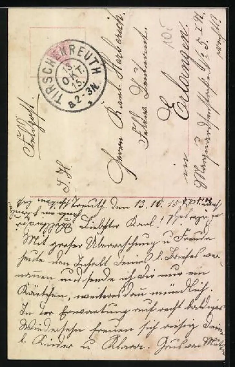 alte Ansichtskarte, gelaufen 1915, Bugspur re. senkrecht, guter Zustand