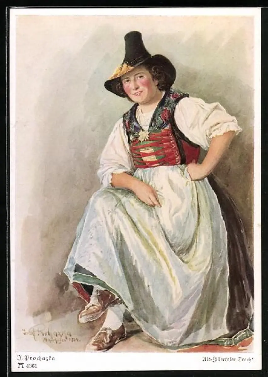 AK Frau in tiroler Tracht mit Hut schlägt die Beine übereinander