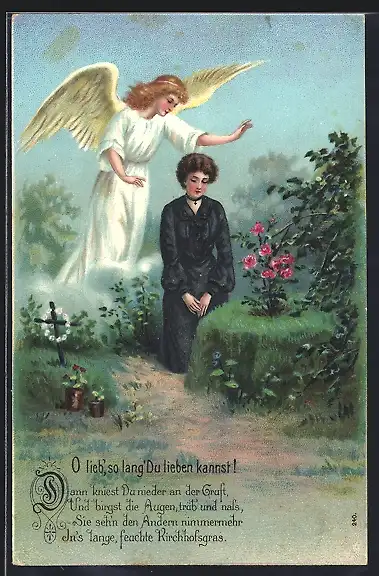 AK Frau kniet am Elterngrab, Engel wacht über ihr