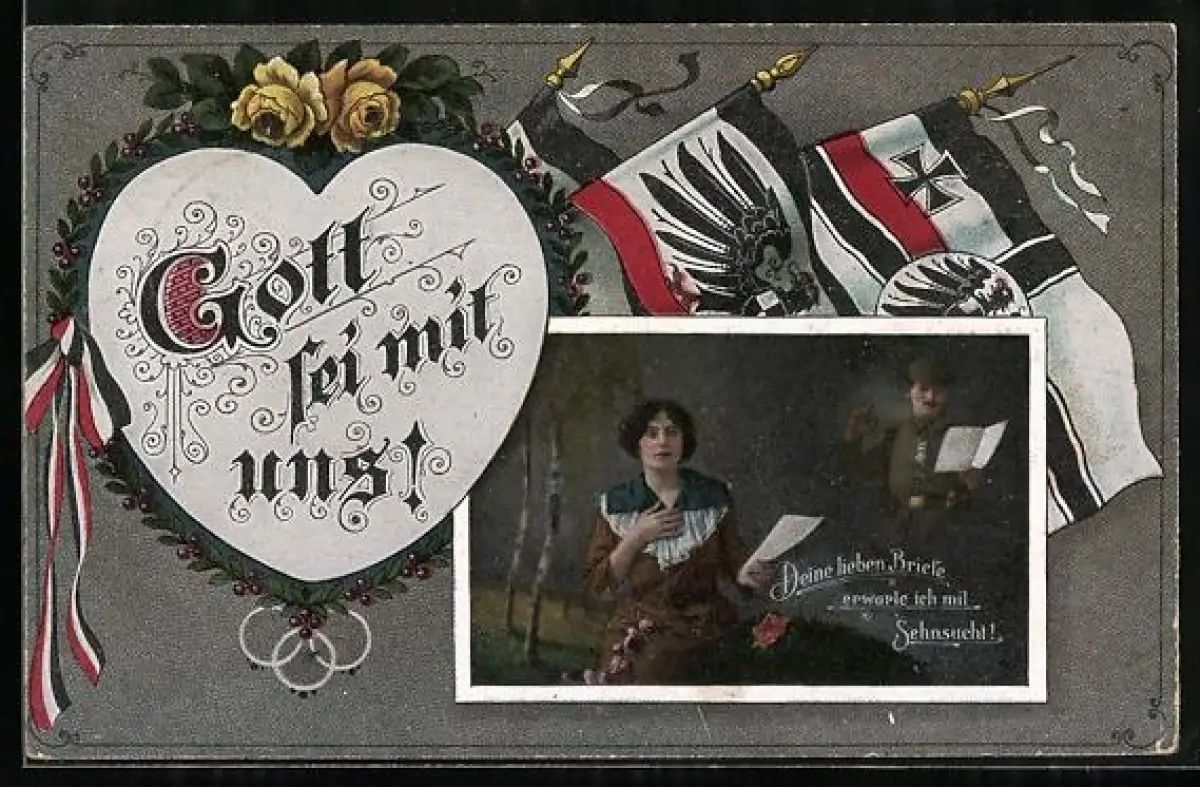 AK Frau liest Brief von Soldaten, Flaggen, Passepartout, Soldatenliebe