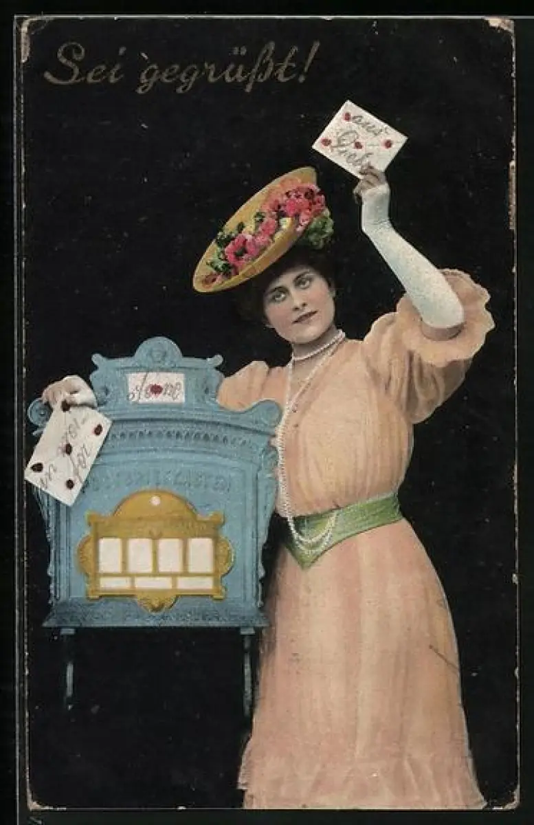 AK Frau mit Briefen an einem Briefkasten, Sei gegrüsst