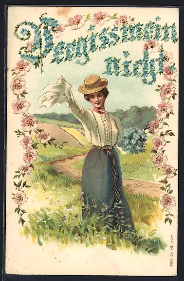 AK Frau mit Hut auf eine Wiese, Vergissmeinnicht
