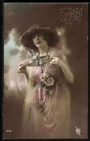 AK Frau mit Hut und Fisch, 1er Avril