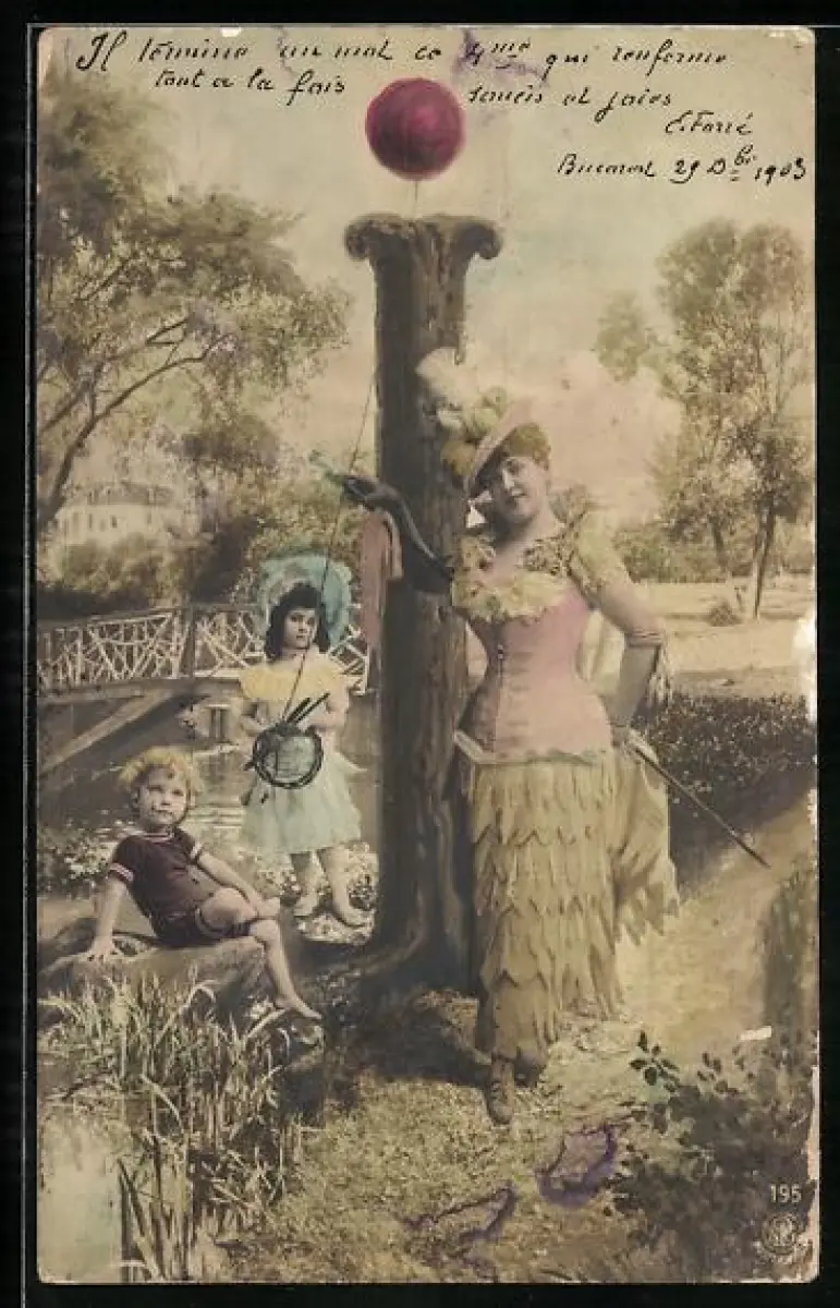 AK Frau mit Hut und Kinder beim Buchstaben I, Luftballon