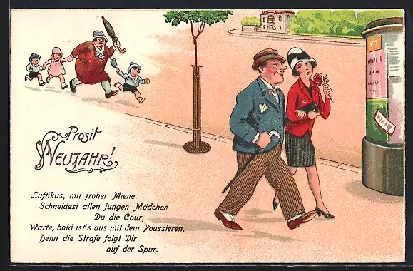AK Frau mit Kindern rennt Pärchen hinterher, Neujahrsgruss