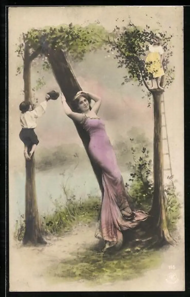 AK Frau mit Kleid und ein Kind am Buchstaben N