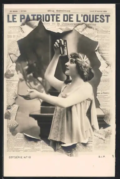 AK Frau mit Kopfschmuck durch zerrissene Zeitung Le Patriote de l`Ouest