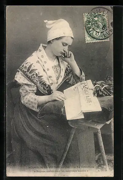 AK Frau mit Kopftuch Zeitung lesend, Le Calvados