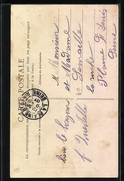 Personenbezogene Daten auf der Rückseite der Karte wurden durch blauen Textmarker unkenntlich gemacht. Die blauen Stellen sind auf die Vorderseite durchgeweicht und wirken sich negativ auf das Postkartenfoto aus