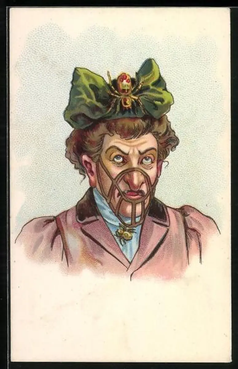 AK Frau mit einem Maulkorb, frauenfeindlicher Humor