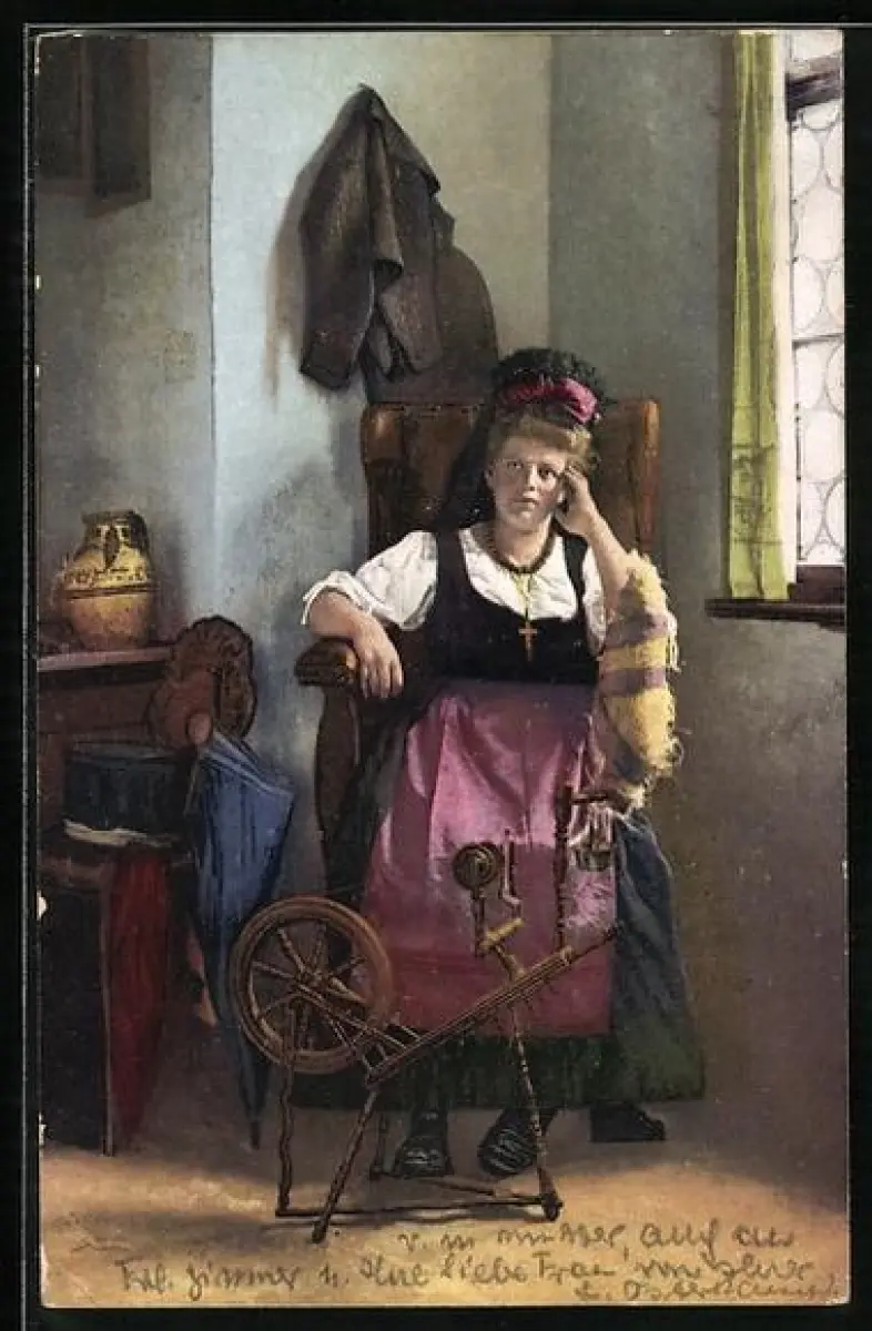 AK Frau mit ernstem Blick am Spinnrad, in thüringischer Tracht