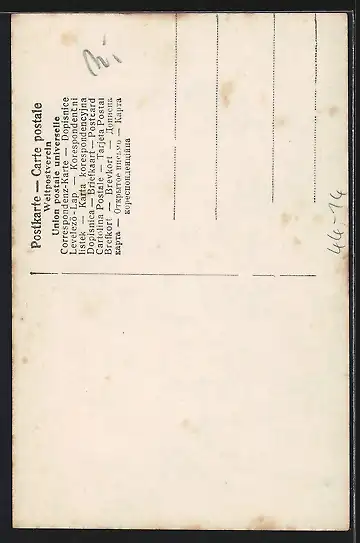 Personenbezogene Daten auf der Rückseite der Karte wurden durch blauen Textmarker unkenntlich gemacht. Die blauen Stellen sind auf die Vorderseite durchgeweicht und wirken sich negativ auf das Postkartenfoto aus