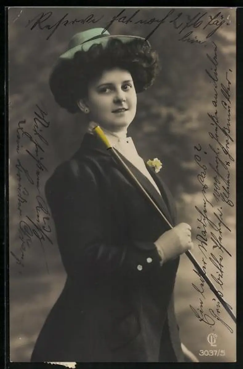 AK Frau mit kleinen Hut und Spazierstock