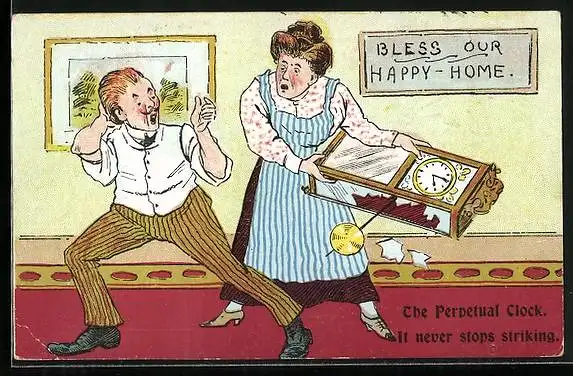 AK Frau schlägt Mann mit einer Uhr, frauenfeindlicher Humor