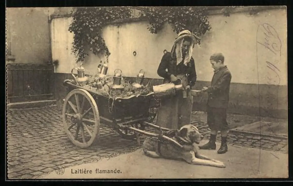 AK Frau verkauft Milch vom Hundegespann aus an einem Knaben