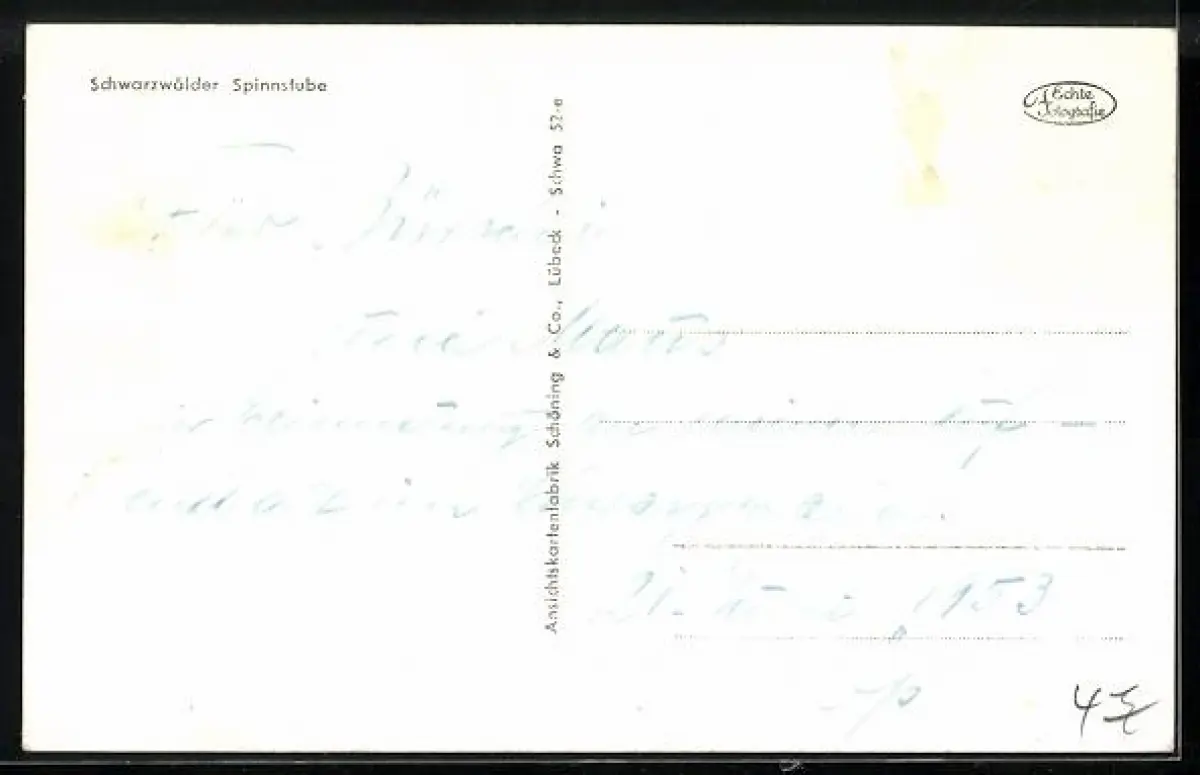 Personenbezogene Daten auf der Rückseite der Karte wurden durch blauen Textmarker unkenntlich gemacht. Die blauen Stellen sind auf die Vorderseite durchgeweicht und wirken sich negativ auf das Postkartenfoto aus