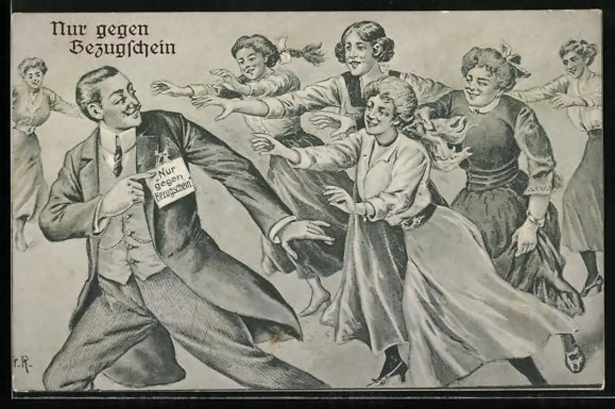 AK Frauen reissen sich um jungen Mann mit Bezugschein