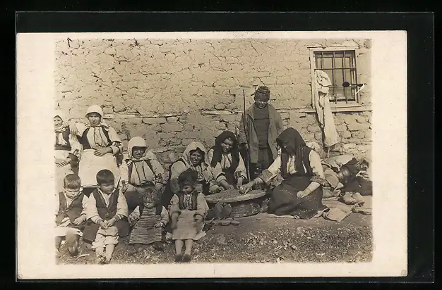 AK Frauen und Kinder in mazedonischer Tracht bei der Arbeit