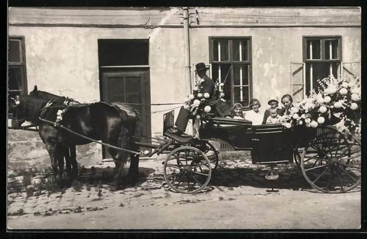 AK Frauen und Mädchen in einer blumengeschmückten Pferdekutsche, mit Kutscher