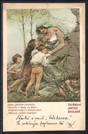 AK Frauengestalt beugt sich helfend zu drei Kindern herunter, Kinderfürsorge