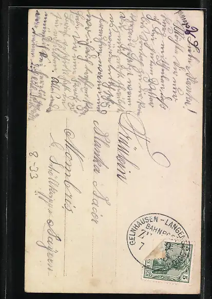 Personenbezogene Daten auf der Rückseite der Karte wurden durch blauen Textmarker unkenntlich gemacht. Die blauen Stellen sind auf die Vorderseite durchgeweicht und wirken sich negativ auf das Postkartenfoto aus