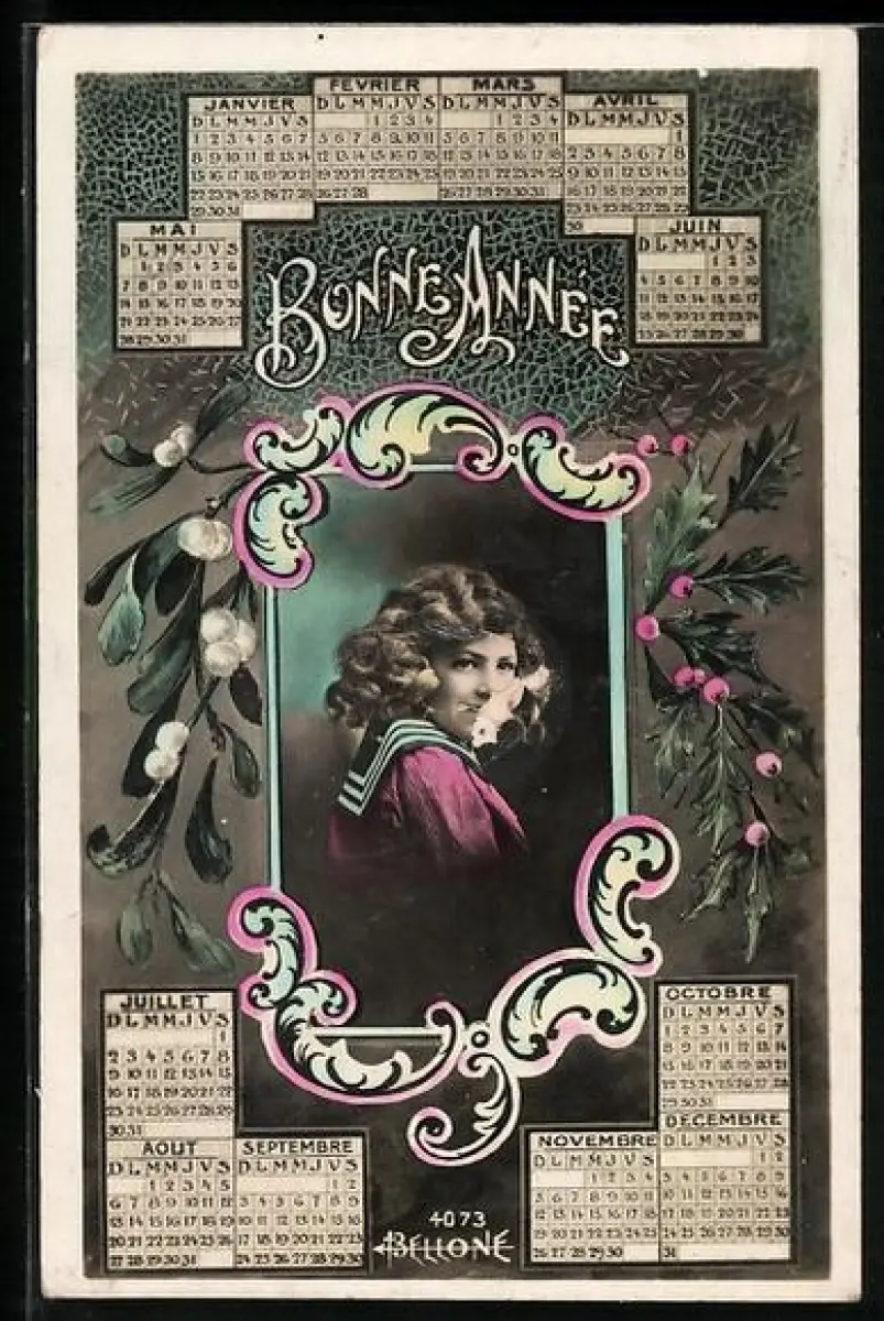 AK Frauenportrait mit Kalender, Neujahrsgruss, Passepartout