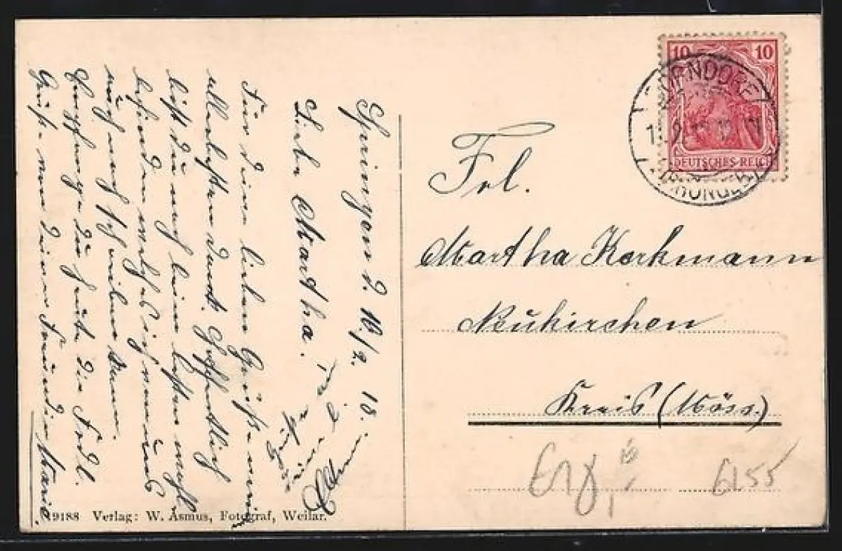 Personenbezogene Daten auf der Rückseite der Karte wurden durch blauen Textmarker unkenntlich gemacht. Die blauen Stellen sind auf die Vorderseite durchgeweicht und wirken sich negativ auf das Postkartenfoto aus