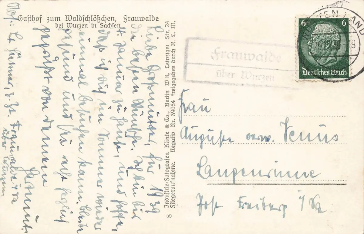 AK Frauwalde bei Wurzen Gasthof Waldschlösschen Sachsen 1939 gelaufen Postkarte