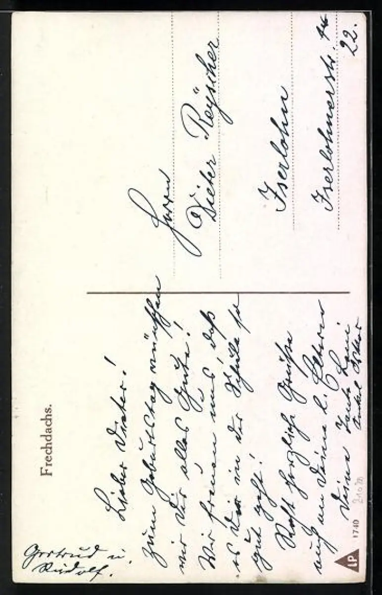Personenbezogene Daten auf der Rückseite der Karte wurden durch blauen Textmarker unkenntlich gemacht. Die blauen Stellen sind auf die Vorderseite durchgeweicht und wirken sich negativ auf das Postkartenfoto aus