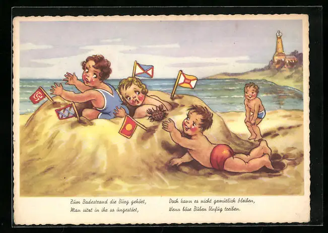 AK Frecher Knabe setzt Strandkrabbe in eine Burg mit Mädchen