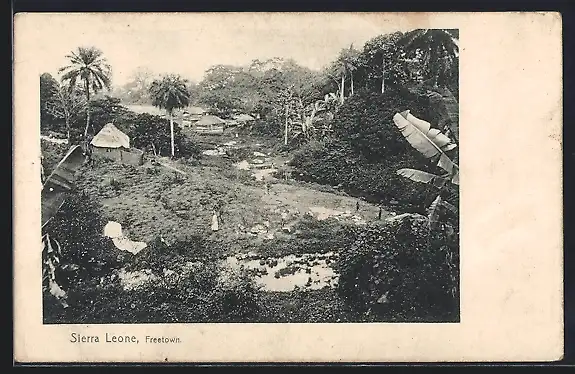 AK Freetown, Ortspartie mit Strohdach-Hütten und Gewässer