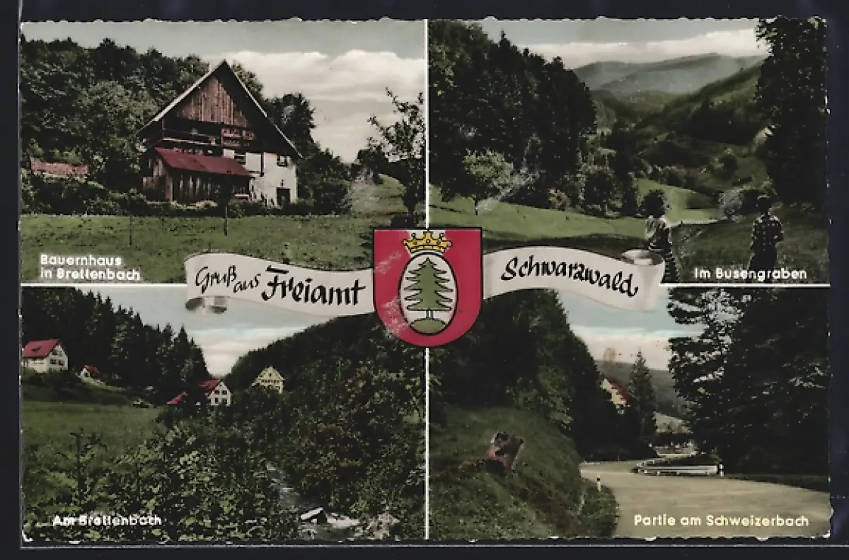 AK Freiamt /Schwarzwald, Bauernhaus im Brettenbach, Busengraben, Partie am Schweizerbach