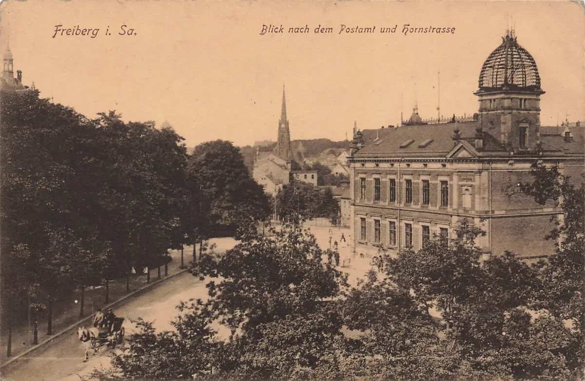 AK Freiberg Postamt Hornstraße Pferdekutsche Sachsen 1918 gelaufen Feldpostkarte