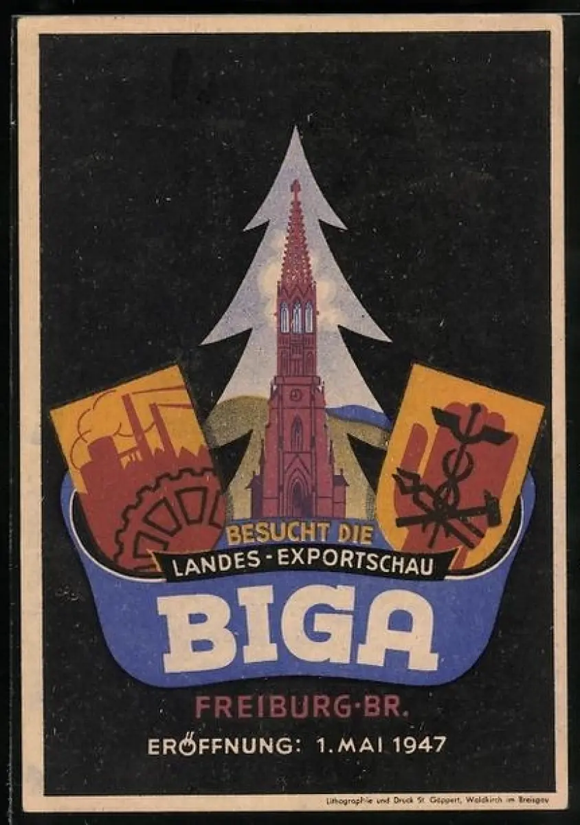 AK Freiburg, Landes-Exportschau BIGA, 1947, Kirchturm und Wappen