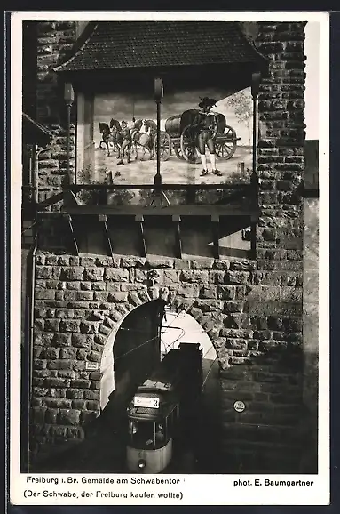 AK Freiburg, Strassenbahn fährt durch Schwabentor, Gemäldde am Tor