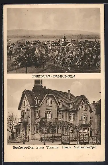 AK Freiburg-Zähringen, Gasthaus Restauration zum Türmle H. Mildenberger, Gesamtansicht mit Fernblick aus der Vogelschau