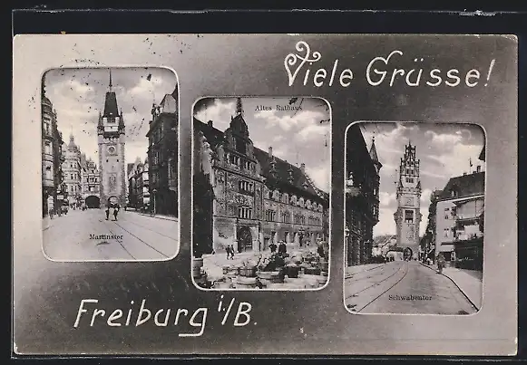 AK Freiburg i. B., Altes Rathaus, Schwabentor, Martinstor