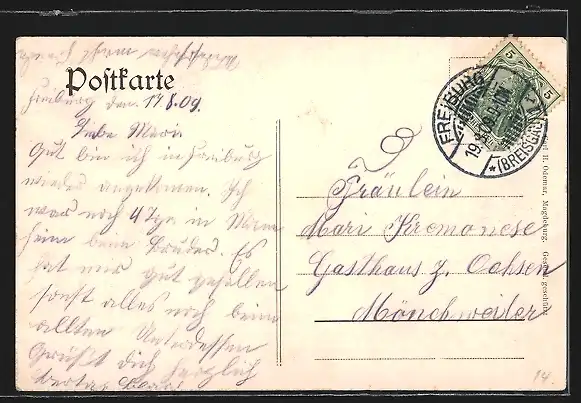 alte Ansichtskarte, gelaufen 1909, Eckknicke oben, Stempelspur, guter Zustand