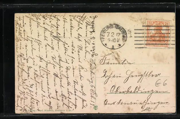 Personenbezogene Daten auf der Rückseite der Karte wurden durch blauen Textmarker unkenntlich gemacht. Die blauen Stellen sind auf die Vorderseite durchgeweicht und wirken sich negativ auf das Postkartenfoto aus