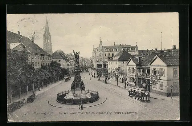 AK Freiburg i. B., Kaiser Wilhelmplatz mit Kaserne und Kriegerdenkmal, Strassenbahn