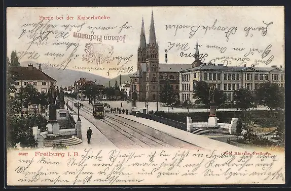 AK Freiburg i. B., Kaiserbrücke mit Strassenbahn