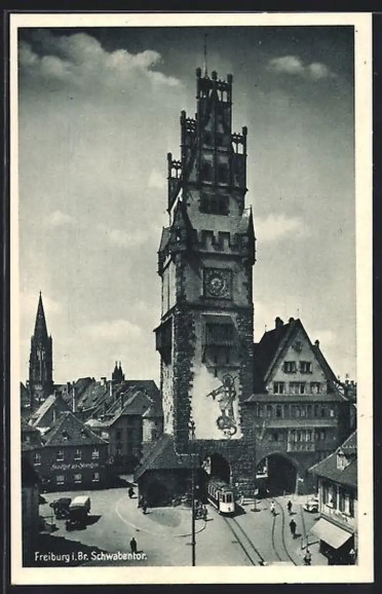AK Freiburg i. Br., Schwabentor, Strassenbahn bei der Durchfahrt