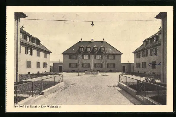 AK Freidorf bei Basel, Der Wohnplatz - Ansicht mit Obelisk und Strassenlampe an Seil
