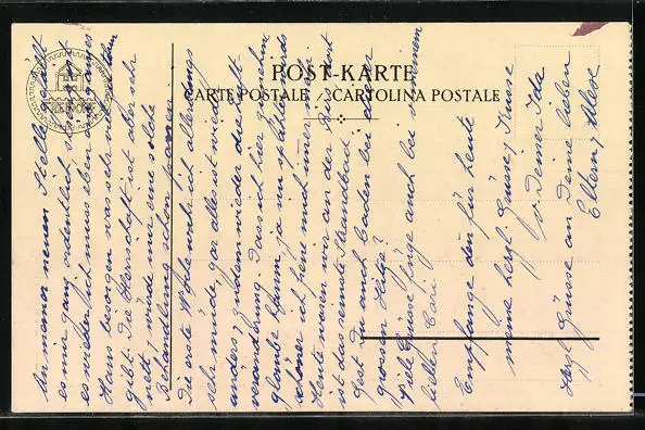 Personenbezogene Daten auf der Rückseite der Karte wurden durch blauen Textmarker unkenntlich gemacht. Die blauen Stellen sind auf die Vorderseite durchgeweicht und wirken sich negativ auf das Postkartenfoto aus