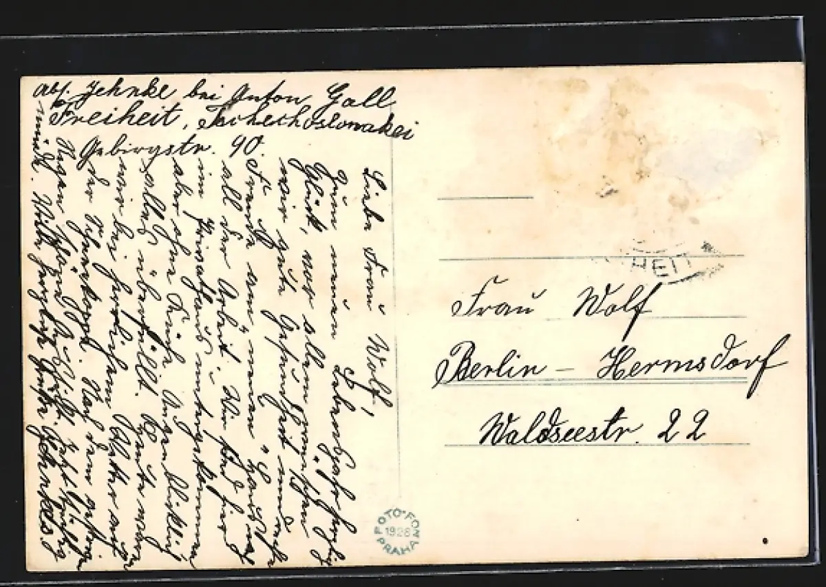 Personenbezogene Daten auf der Rückseite der Karte wurden durch blauen Textmarker unkenntlich gemacht. Die blauen Stellen sind auf die Vorderseite durchgeweicht und wirken sich negativ auf das Postkartenfoto aus