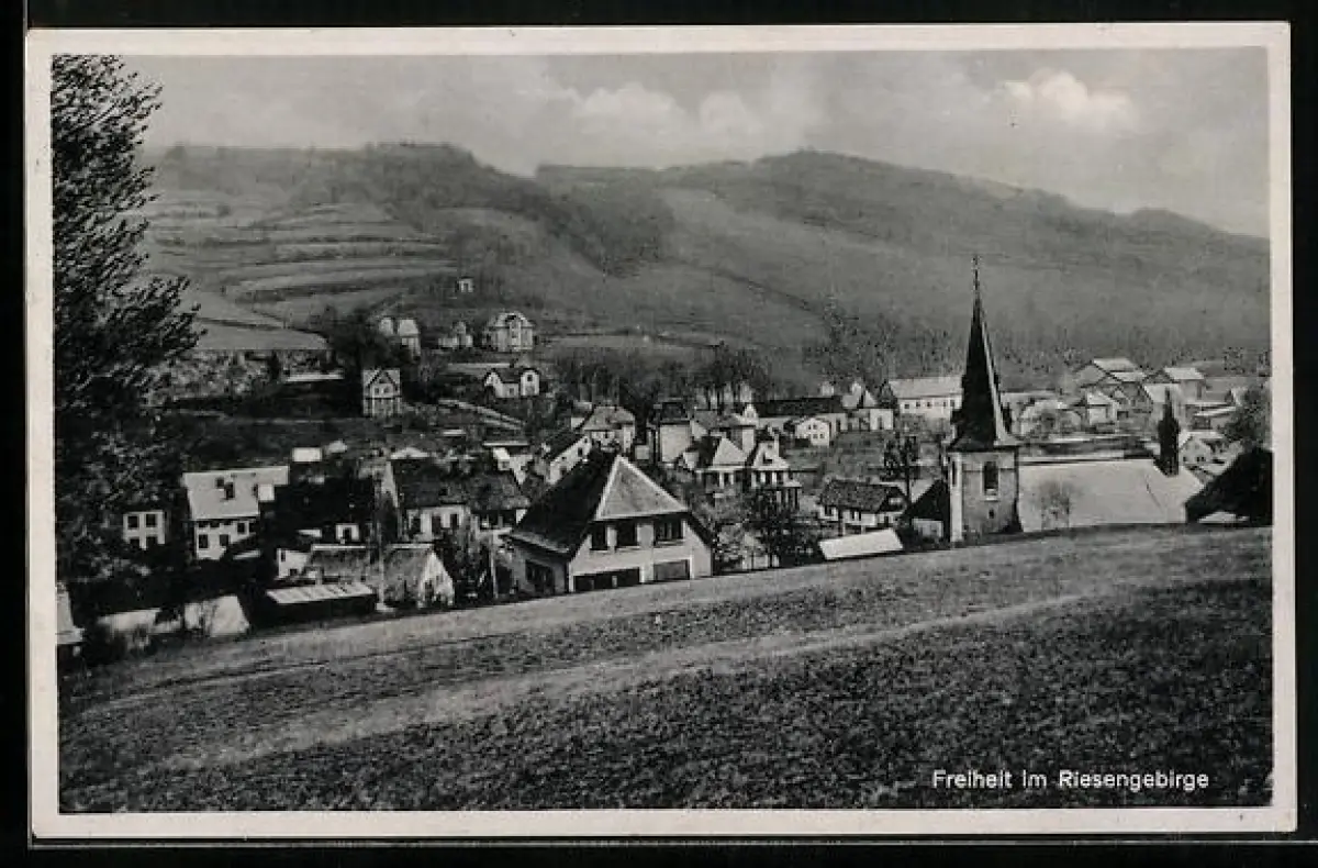 AK Freiheit im Riesengebirge, Panorama mit Kirche