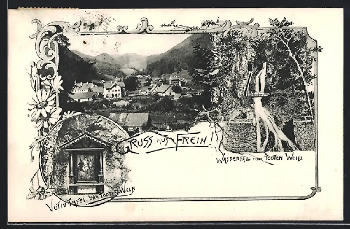 AK Frein / Mürz, Wasserfall zum Todten Weib, Votiv-Tafel beim Todten Weib, Ortsansicht aus der Vogelschau