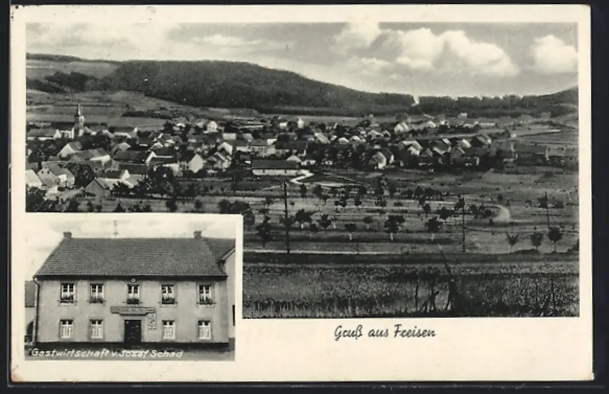 AK Freisen, Gasthaus v. Josef Schad, Ortspanorama