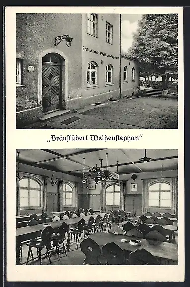 AK Freising, Gasthaus Bräustüberl Weihenstephan, Gebäude mit Gartenblick, Innenansicht mit bild