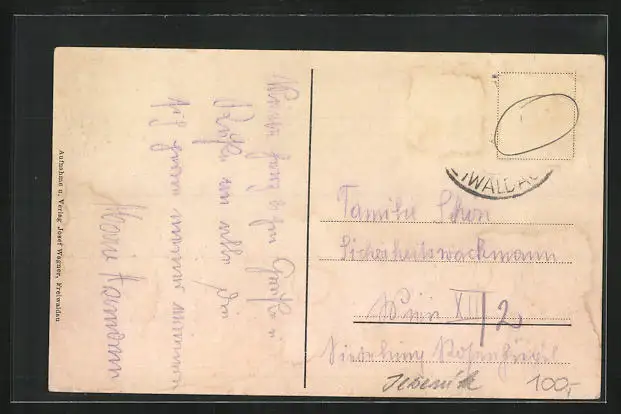 Personenbezogene Daten auf der Rückseite der Karte wurden durch blauen Textmarker unkenntlich gemacht. Die blauen Stellen sind auf die Vorderseite durchgeweicht und wirken sich negativ auf das Postkartenfoto aus